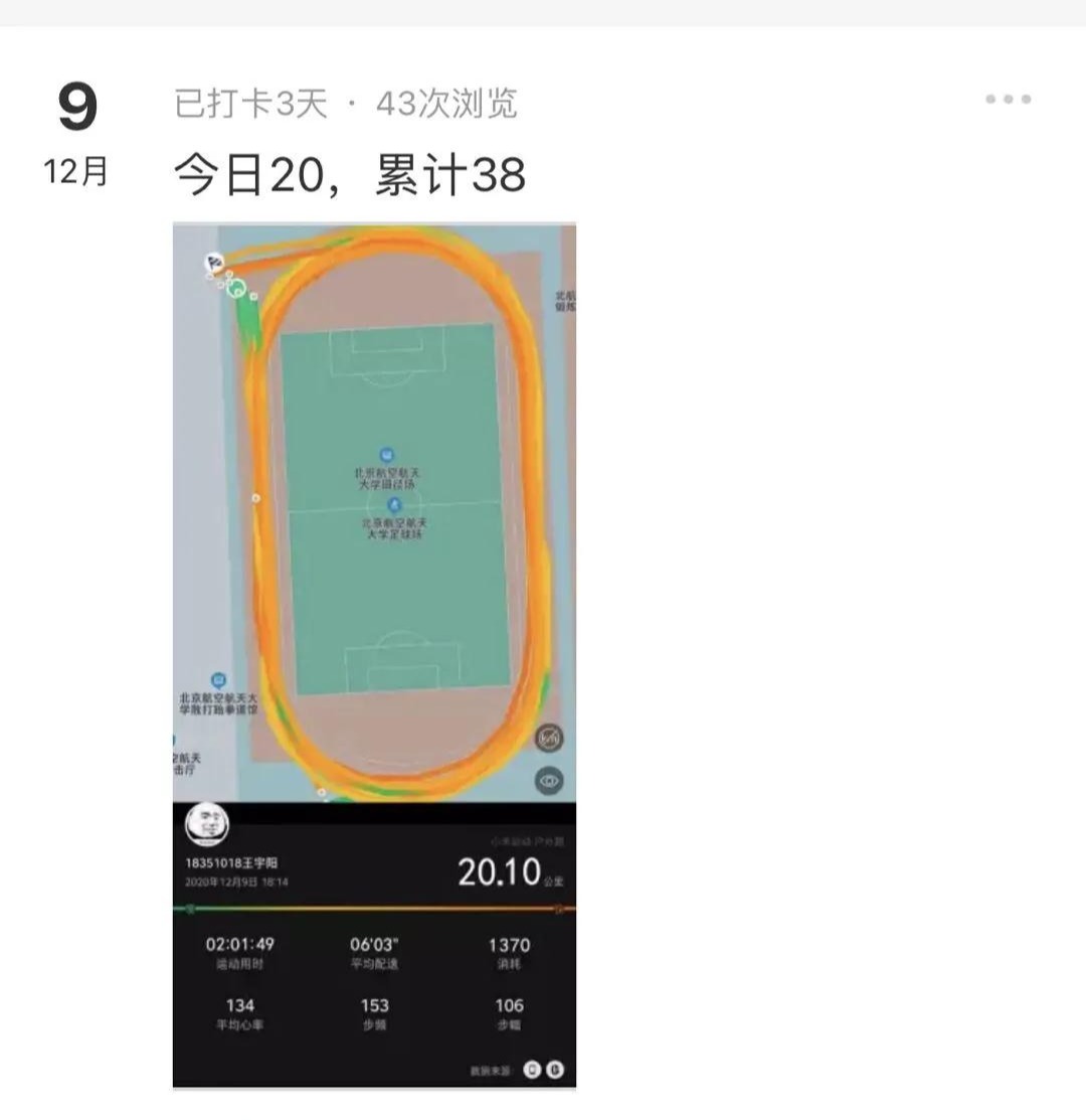王宇阳同学在12月9日单次打卡里程20千米,获得“长跑能手”称号。